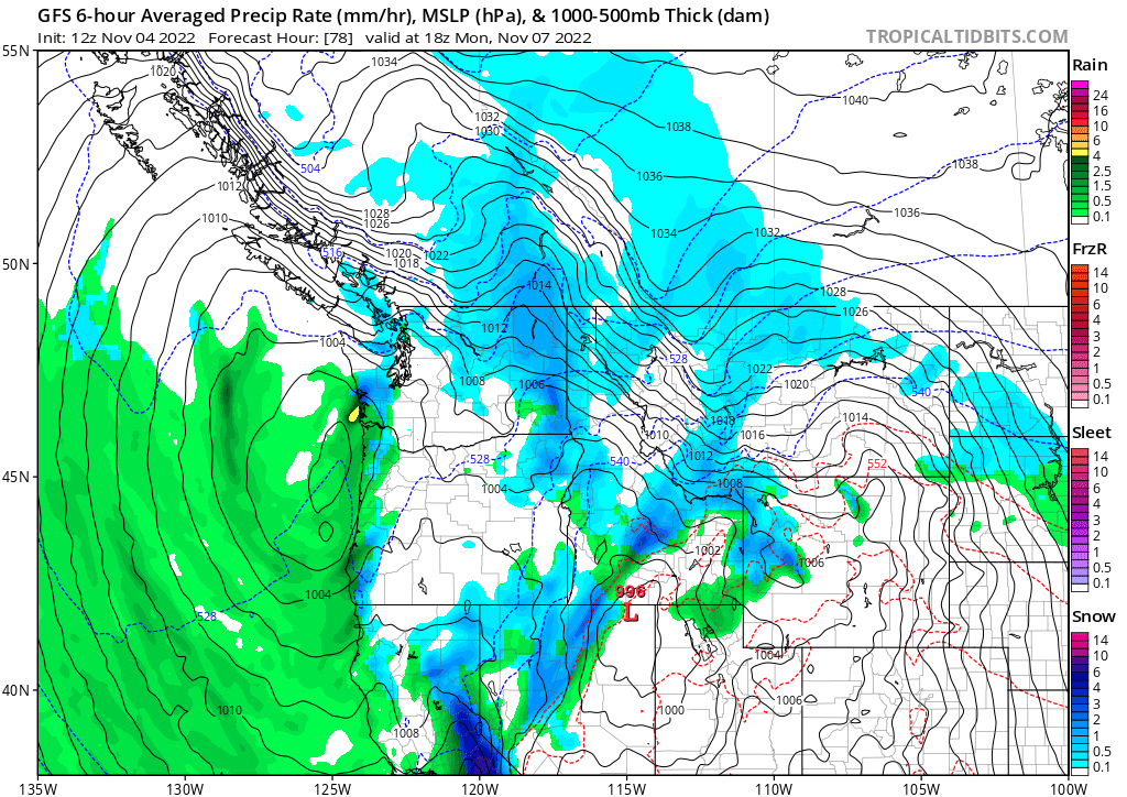 But since this low is tracking south of us, the front will move very slowly across the region. It won't reach extreme eastern WA and the Panhandle until 24 hours later, Monday morning.